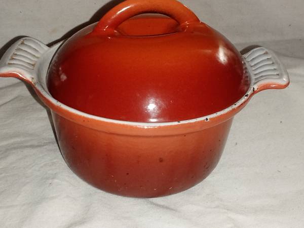 5" Round Vintage Cast Iron Dutch Oven Casserole Enameled Cast Iron with Lid Made in Holland and 12 on the underside Orange Cast Iron Enamele Few nicks *Check out "more ads by this user" link* 20.00...