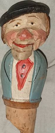 Vintage, hand-carved wooden bottle stopper, produced by the Italian company Anri, known for their mechanical, hand-carved items.