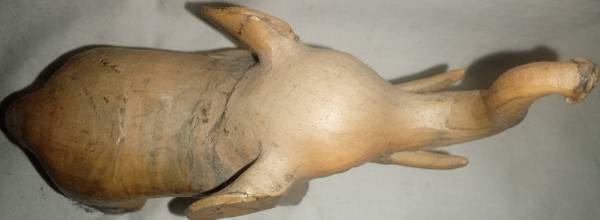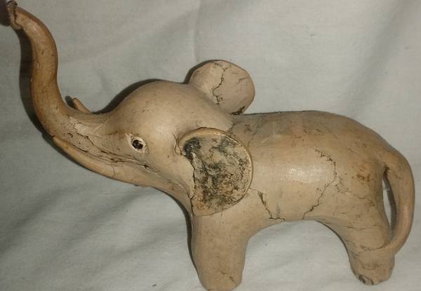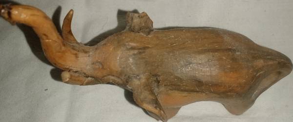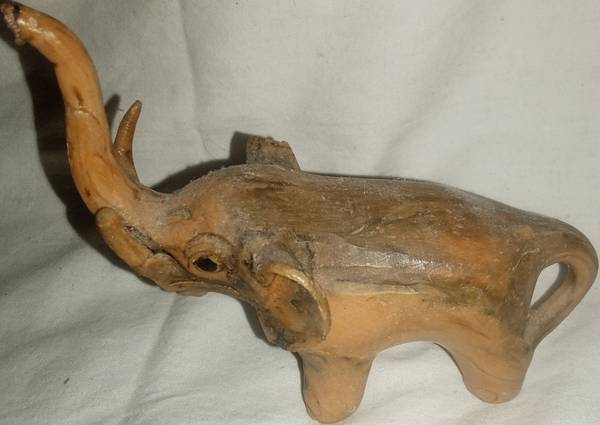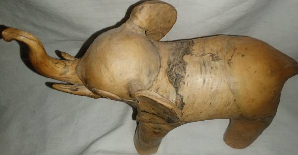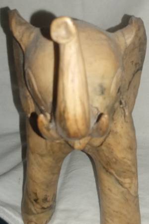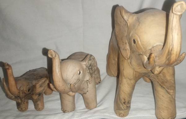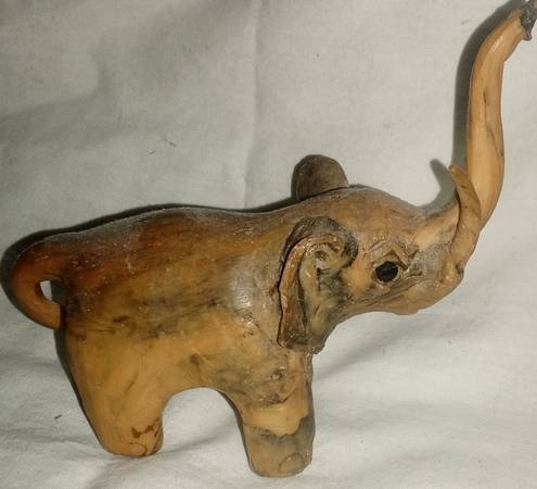 DROPPED $10.00 Elephant figures. Hand crafted with multi colored wood/grain Intricate and interesting 1)10" tusk to tail 7" hoof to trunk 3" wide at the rear 2)6" tusk to tail 5" hoof to trunk 2"...