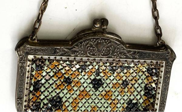 This an antique 1920s Art Deco Mandalian Mfg. Co. mesh flapper chain purse, featuring a unique design with colorful mesh material and a style reminiscent of the flapper era. As an original piece from the 1920s, it embodies the look and feel of the Art Deco movement, making it a rare and collectible item for vintage accessory enthusiasts.