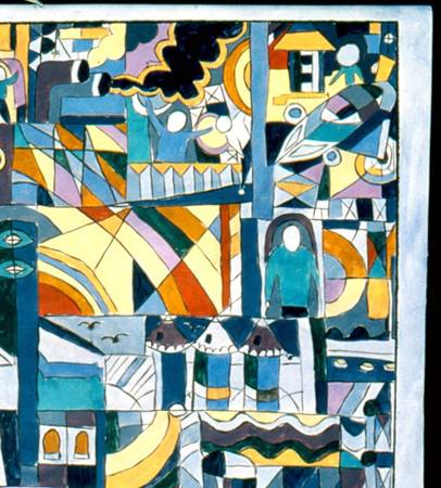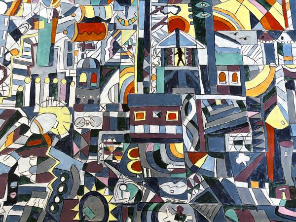Original painting Acrylic on canvas Extremely large Late 20th century mod depiction of surreal environment Signed by artist On dowels, strung for hanging SIZE of Painting: 75" x 51" CONDITION: Good....
