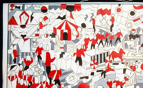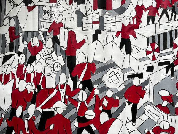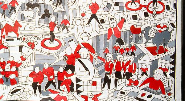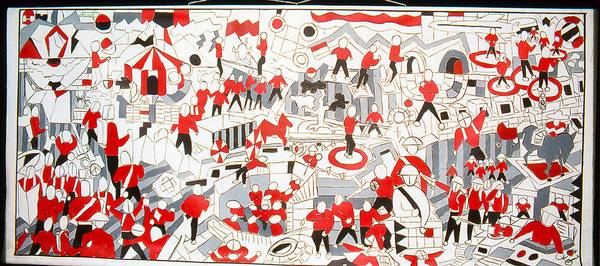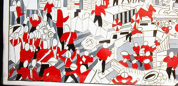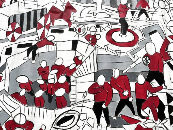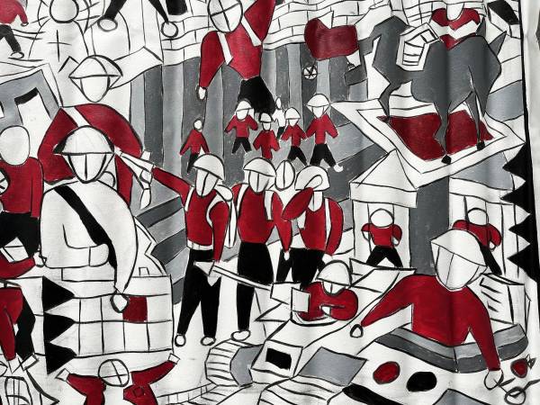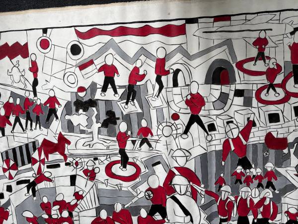 Original painting Extremely large Acrylic on canvas Late 20th century stylized depiction of chaos Signed by artist SIZE of Painting: Approximately 8-feet Wide x 4-feet High CONDITION: Fair to Good....