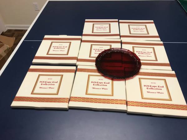 A fabulous 8 place dinner setting with many accessories Vintage ruby red collection of pressed glass called “Sandwich”, whose intricate designs, fine background and sparkling brilliance reflected the superb craftsmanship of its makers.