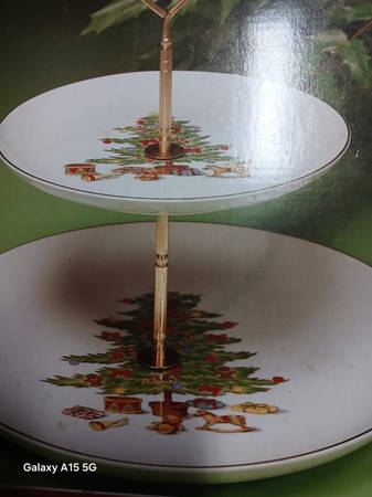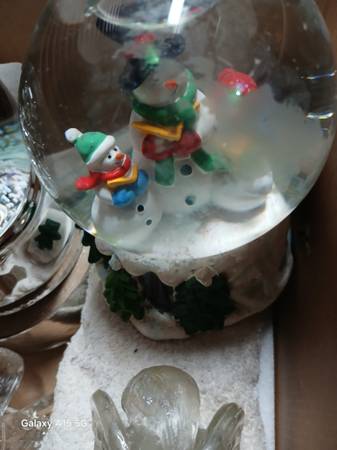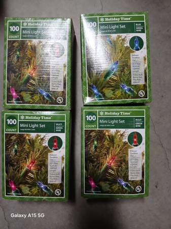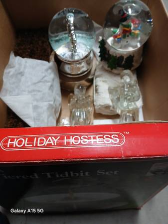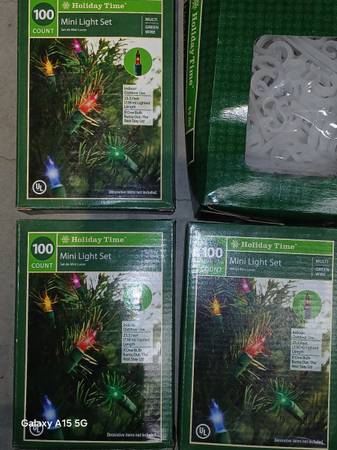 - 1 new in the box tìbit tray -4 new boxes of light's- 2 glass angel candle holders - 2 snow globes -5 small green extension cords -- storage locker pickup 85 cash on pickup-- the globes could use some tlc---- plus 4 more. boxes of lights - 1 vintage christmas tree stand solid..-- christmas plate-- multi plugʻ for lights