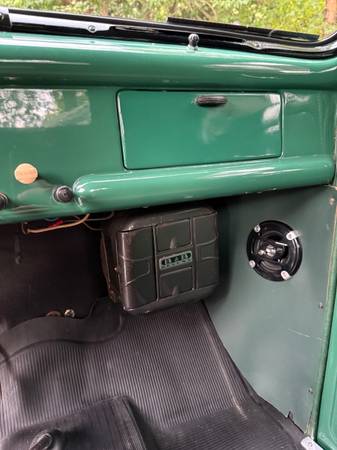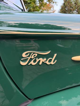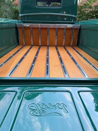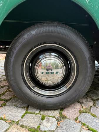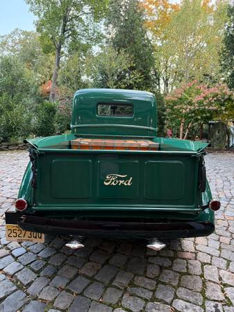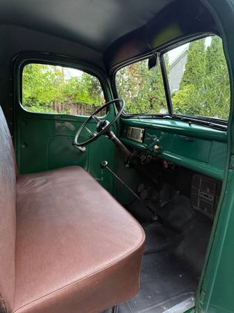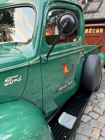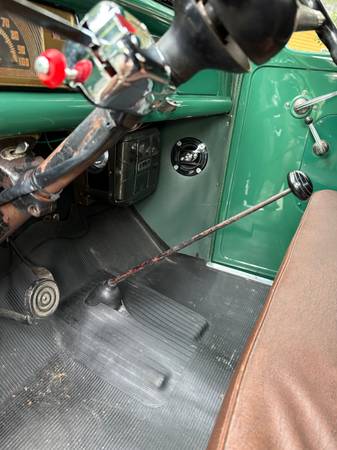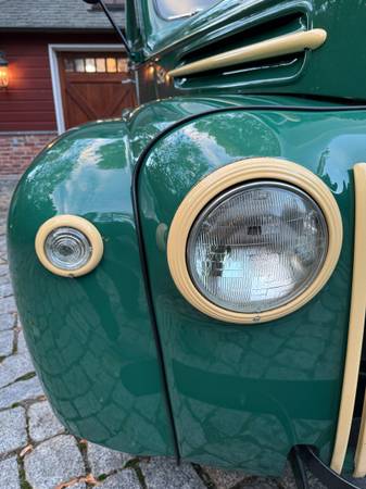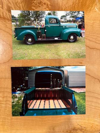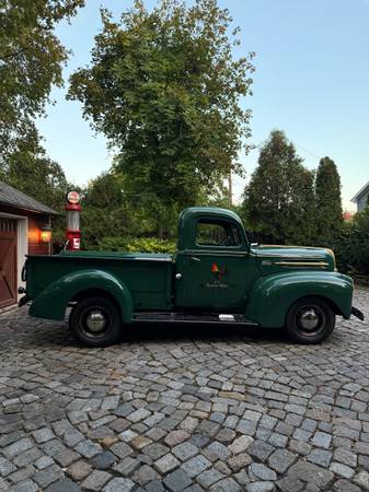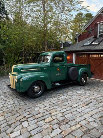 I own a 1947 Ford Series 79C half ton pickup that underwent a body off refurbishment under previous ownership in the early 1990s. My mother purchased it in 2014, and I am now selling it on her behalf. It is powered by a 239.4ci flathead V8 paired with a three speed manual transmission, and it is finished in green with beige accents over brown vinyl upholstery. It has black 16 inch steel wheels, bright hubcaps and trim rings, wood bed flooring, a storage box, a cabin heater, bench seating, and a dual exhaust system. I converted the electrical system to 12 volts under my ownership.