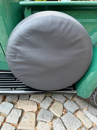 The black painted 16 inch steel wheels with bright hubcaps and trim rings are mounted with 225/70 Goodyear Integrity tires. A spare under a soft cover is secured to the driver side. Braking is handled by four wheel drums.