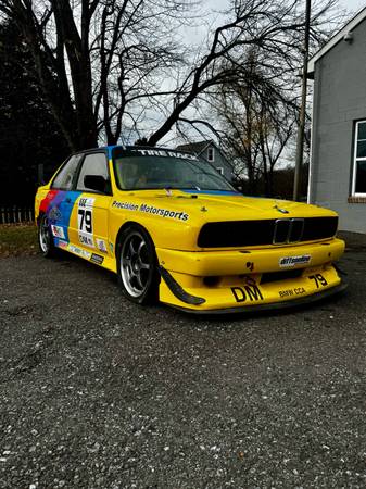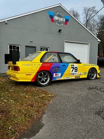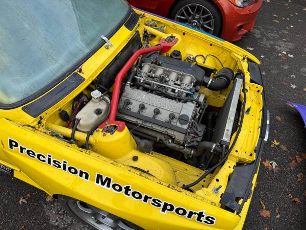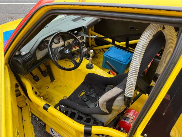 This 1988 E30 M3 started off life as a street car and was eventually built into the car you see today. The yellow paint and M stripes are in good shape with vinyl livery graphics applied on top. The yellow extends inside and the interior includes a full cage painted to match. This car was raced at tracks across the East Coast and the logbook will be included with the sale. The car has one season of use on the rebuilt S14 engine. It was never brought to redline during that time.