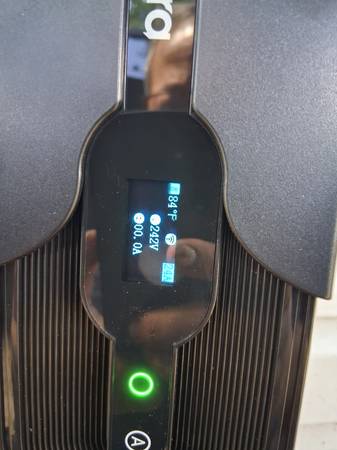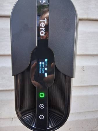 Tera wall-mounted Level 2 EV Charger, 240V, 24A output. Digital display with temperature, voltage, current, and WiFi indicator. Works with most EVs (J1772 plug).