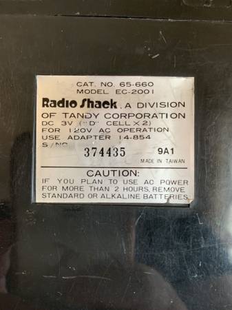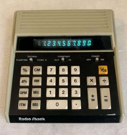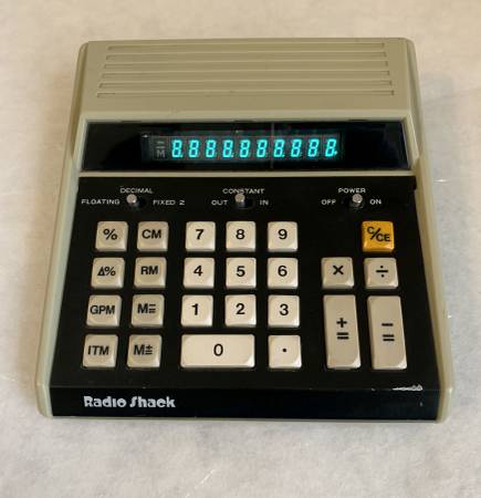GOOD WORKING CONDITION: The Radio Shack EC-2001 (a division of the Tandy Corporation) was made from 1978-1985 and is an arithmetic calculator with 10 digits. It has a VFD (vacuum fluorescent) display. It runs on two "D" cell batteries -- it can also run on AC power but I do not have the power cable.