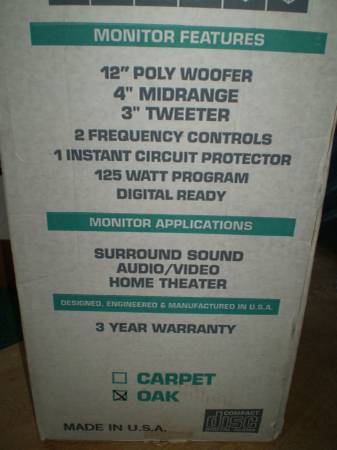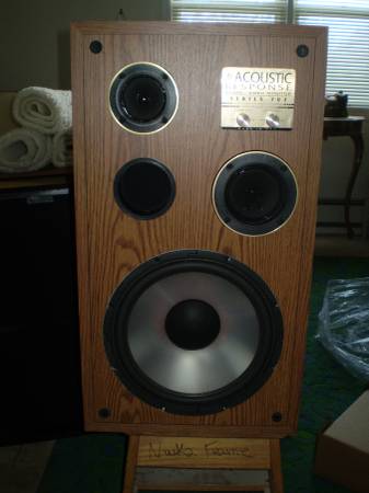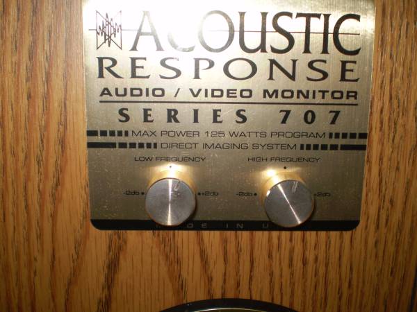 ACCOUSTIC RESPONSE (SERIES 707) 3 WAY SPEAKERS WITH CIRCUIT BREAKER AND ADJUSTABLE MID/HIGH RANGE 125 WATTS @ 8 OHMS OAK WOODGRAIN FINISH 28" TALL BRAND NEW IN BOX NEVER USED $125 PAIR