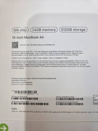 Model: MacBook Air Screen Size: 15 inches Processor: Apple M4 Processor Speed: 4.00 GHz GPU: Apple 10-Core RAM Size: 24 GB SSD Capacity: 512 GB Color: Midnight Release Year: 2025 Maximum Resolution:...