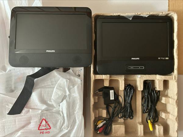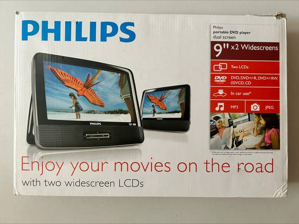 Philips dual 9” LCD screens portable DVD player. Great for long drives in the car with kids in the back seats. Same dvd image shows on both screens. Includes straps to hold to the back of the front seats. Comes with car power cord, outlet power cord and av cords to connect monitors. All in original packaging and barely used. Sells for $199.99 at Walmart.