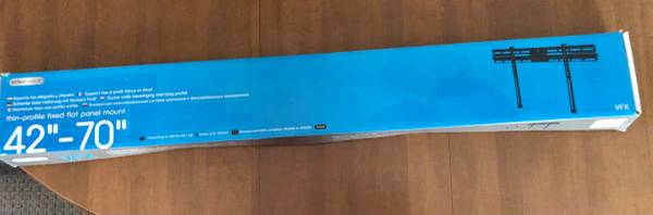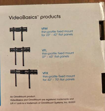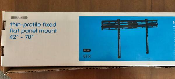 Video Basics Model VFX Thin Profile Fixed for a Flat Panel Mount Width: 42”-70” NOTE: Weight Capacity: 200 pounds New in Sealed Box Offered at $40 Cash and Carry Only Smoke / Pet Free Home