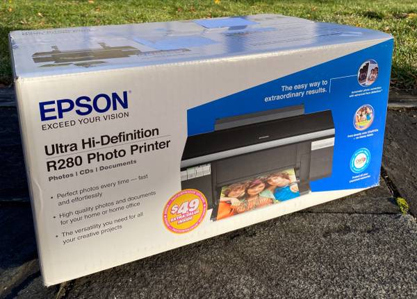 NEW Sealed in Box Epson R280 Ultra Hi-Definition Photos CDs DVDs Documents Printer. Model R280 Injet Printer. Sold comps on Ebay are +$125 plus shipping. $50 cash only. In person pick up. Price firm.