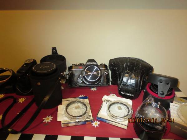 KONICA AUTO REFLEX TC FILM CAMERA/HEXANNON AR 50 mm F17 IN CASE---VIVITAR AUTO TELEPHOTO LENS #28433674 55mmF17---KONICA HOYA HEXAGON 55mm SKYLIGHT 28/F3.5 LENS IN CASE--HOYA SPECIAL EFFECT FILTERS 55mm MULTI VISION IN CASE---HOYA SOFT SPOT-HOYA CROSS SCREEN-HOYA MULTI VISION IN BOXES--ORIGINAL MANUALS--ALL MADE IN JAPAN--MOST ACCESSORIES NEVER USED.
