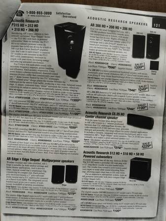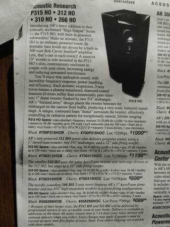 Pair of Acoustic Research 312HO speakers in very good condition. They are about 44 inches tall, 19.5 inches deep 10.5 inches wide, and weigh about 72lbs apiece. New, these speakers were $1,200.