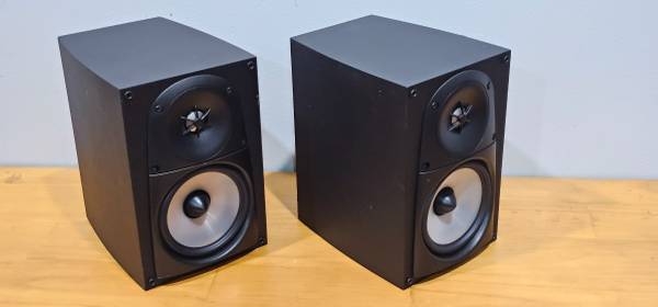 Two-way, rear-ported bass-reflex design with 5.5″ treated cone mid/woofer and compact tweeter — surprising full sound from a small cabinet. Cabinets are clean; drivers test fine. Ideal for apartment stereo, desktop rigs, or surround channels.