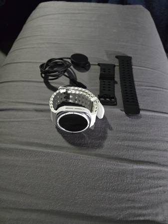 The watch comes with the charger, original white band, and also an additional black band in the same model as the white band.