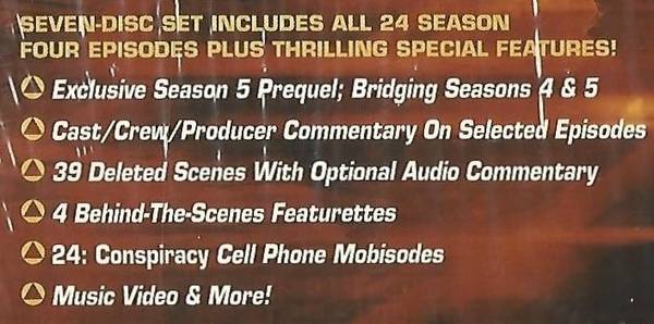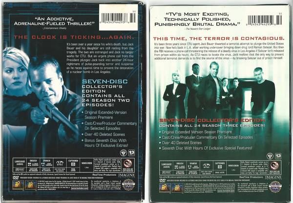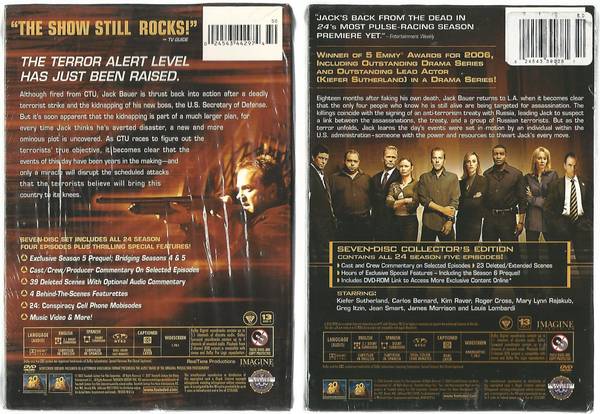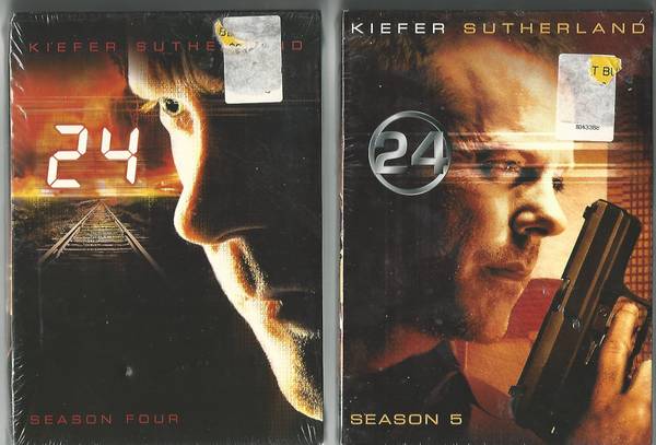"24": television series (w/Keifer Sutherland) ... (Seasons 1, 2, 3, 4 & 5) - complete DVD box sets ... Seasons 1-3 (viewed once) - Seasons 4-5 (unopened/sealed) ... selling only as a single lot.