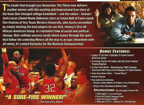 (2006) "Glory Road" DVD ... co-produced by Walt Disney Pictures & Jerry Bruckheimer Films ... widescreen format ... includes Special Features - such as extended interviews with players & colleagues of coach Haskins ... previously viewed.