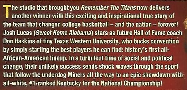 ... Glory Road is an American sports drama film based on a true story surrounding the events leading to the (1966) NCAA University Division Basketball Championship. Don Haskins - head coach of Texas Western College, coached a team with an all-black starting lineup, a first in NCAA history. Glory Road explores racism, discrimination & student athletics. It won the (2006) ESPY Award for Best Sports Movie.