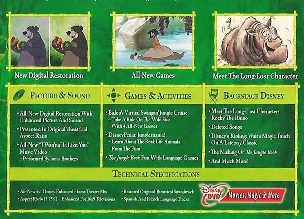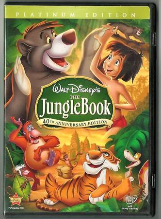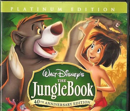 2) ... DVD (two-disc set) featuring the (1967) American animated musical comedy film "The Jungle Book" produced by Walt Disney Productions - based on the (1894) Rudyard Kipling book of the same name ... this DVD version is the 40th Anniversary - Platinum Edition (2007) ... which includes all-new digital restoration with enhanced picture & sound ... Disc #1 contains the feature film - approx. runtime (78) minutes ... Disc #2 contains Bonus Material featuring games, activities and "Backstage Disney" and more! ... previously viewed ... includes original plastic case!