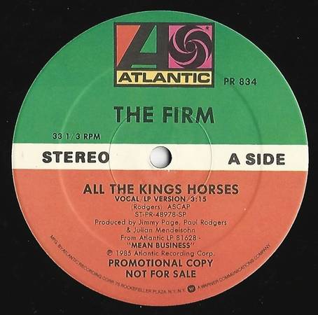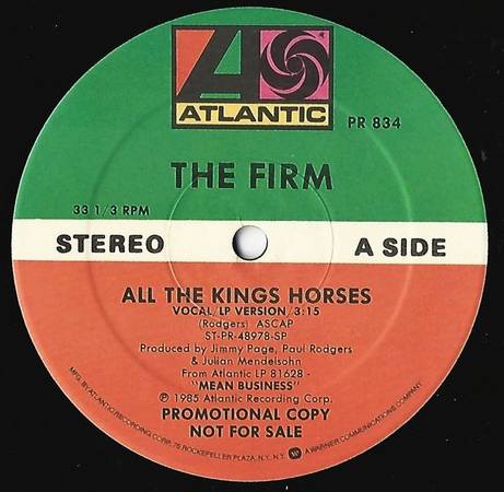 *... (12") Single - "Promotional Copy - Not For Sale"..."All The Kings Horses" (1985) ... (33-1/3 rpm - Stereo) ... Atlantic Records label # (PR 834) ... plays the same (3:15) Vocal / LP version of the song - "All the Kings Horses" - on both sides ... each side is labeled as "A-Side".