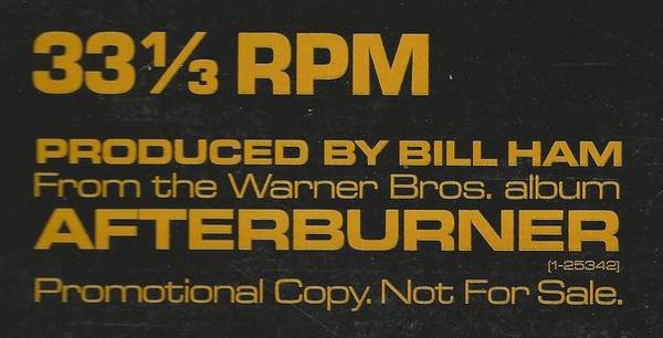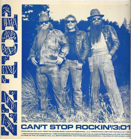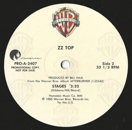 Five (5) different ZZ Top - (12") vinyl record PROMOS (33-1/3 rpm) ... each disc contains one (1) separately recorded "single" song from the (1985) ZZ Top album: "Afterburner" ... all are labeled "Promotional Copy - Not For Sale" and appear to have never been played ... each is presented within its own promotional custom cover sleeve (w/blank "white-back") ... all covers are in VG condition with minimal ring wear!