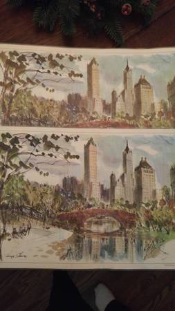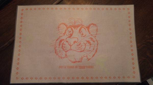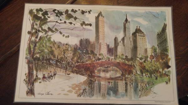 Vintage laminated placemats from Esso oil/gas corporation featuring "Put a Tiger in your Tank" and a tiger graphic on one side and artwork by George Shaw on the reverse side...includes scene of Central Park, New York City. Measures 11 1/2" x 17 1/2"....good vintage condition- $5 each