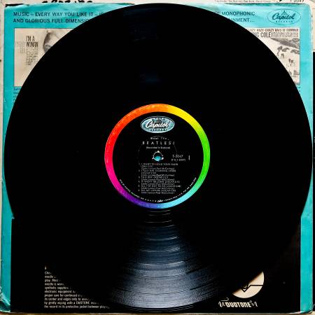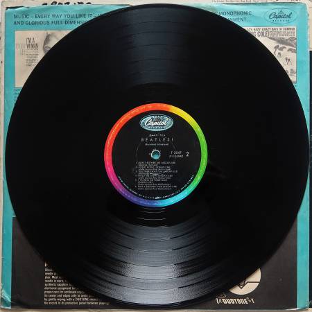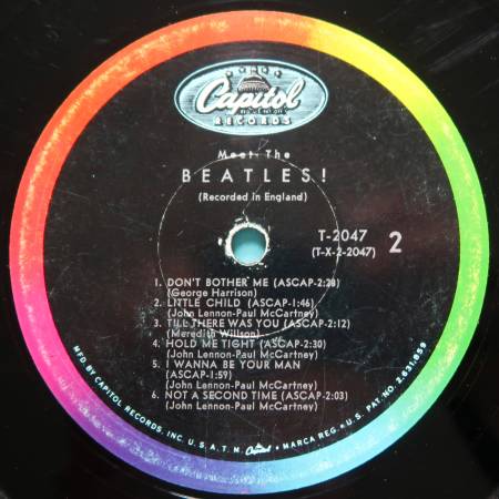 The Beatles "Meet the Beatles" 1st Album .1964. Capitol T 2047. Mono High Fidelity. Original inner sleeve. Name written on front and back of Jacket. Jacket bottom seam split. Scuffs vinyl. VG $11.