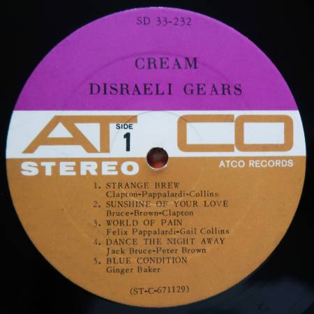 Cream "Disraeli Gears" 1967. ATCO SD 33-230. Stereo. Light scuffs vinyl. Jacket very good. $14.