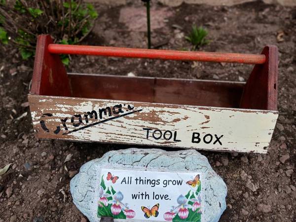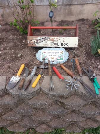 Gramma's tool box, with TEN vintage garden tools. ALL for $15.00 Call Vince @