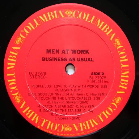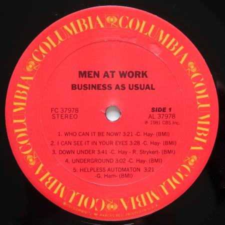 Men at Work "Business as Usual" 1982. Columbia FC 37978. Light wear jacket. Light scuffs vinyl Original inner sleeve with lyrics. VG+. $7.