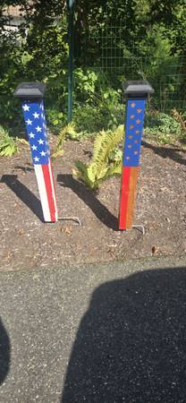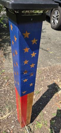 Show your patriotism with these custom made posts with a solar light. A great addition to your yard or garden. Painted and sealed for outdoor use. They measures about 34" tall. They have nicks and splits for character. Made from reclaimed lumber. There are 2 versions one with white painted stars and stripes and one with natural and slightly burned stars and stripes. No holds without a deposit. If seriously interested contact me with definite plans for pickup. For an additional $20 I can deliver within a reasonable distance. Click on seller's details to see more of my listings.