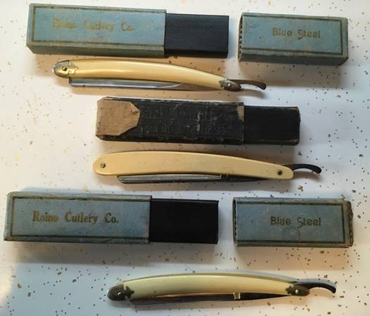 • TWO: ROMO CUTLERY CO. BLUE STEEL STRAIGHT RAZORS W/ ORIGINAL BOXES