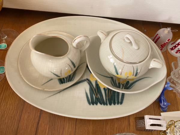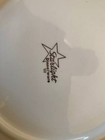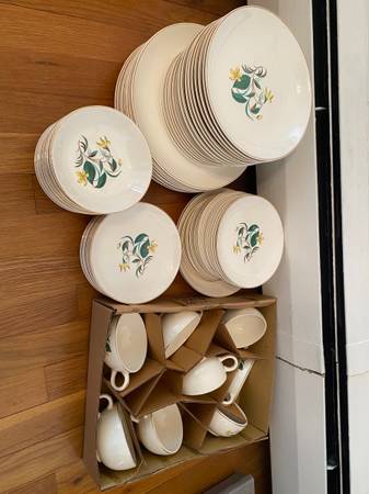 Selling a beautiful, comprehensive set of vintage Salem China Company "Starlight" pattern dinnerware, produced in the USA circa the 1950s. This elegant set features a creamy white base, vibrant yellow and green floral motifs, and genuine 23k gold trim.
