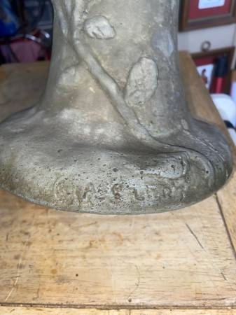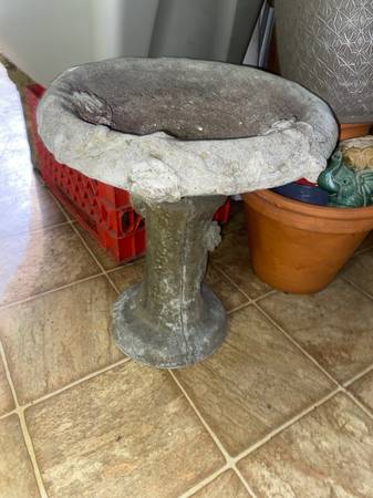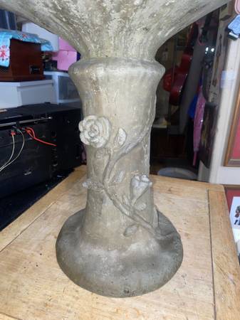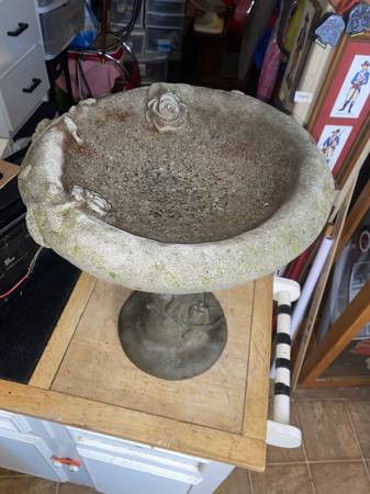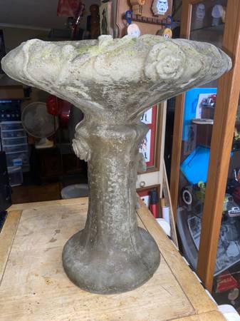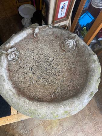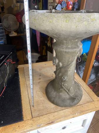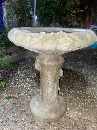 This is very old antique ornate cast cement or concrete since it's made mixed with pebbles outdoor bird bath. This is something I've been looking for since I'm a teen basically. This is well over 100 years old. It measures 17 inches high 15 long and about 2 1/1 inches deep in bath part. I cleaned it before posting but kept its original patina but just using soap and water and a brush. Has flower or roses going around with tens and leaf's as well as on top of it. It's cast since you can see seen where they join in middle. Best part it's signed and dated I believe but date is so hard to read. I took photos it's in front of the name on bottom of it. I can't make out the name but I'm sure research and you can. You can make out some letters. Almost looks like 1825 but I doubt that. The pictures might not do it justice.