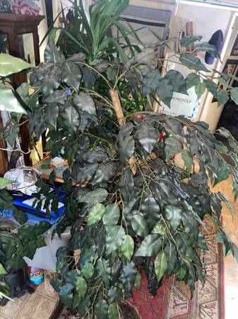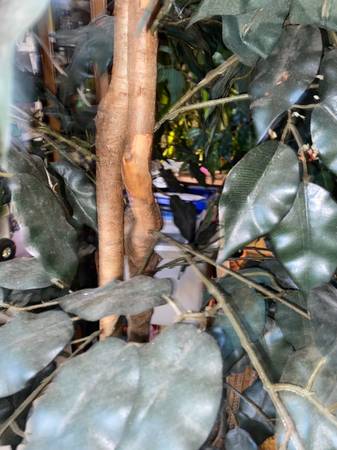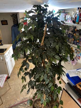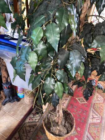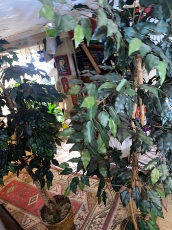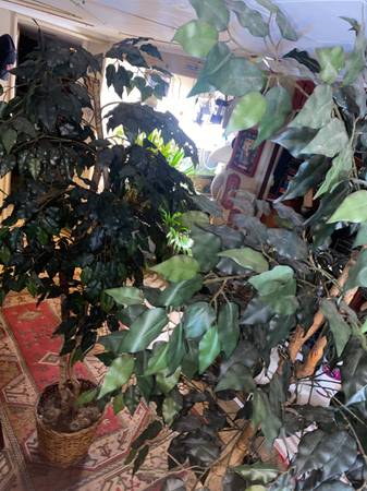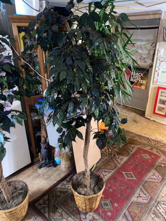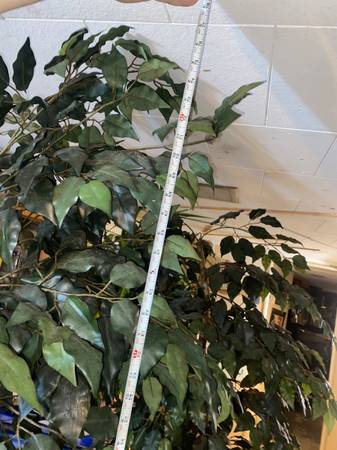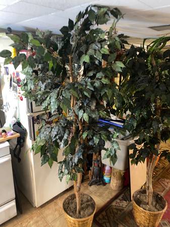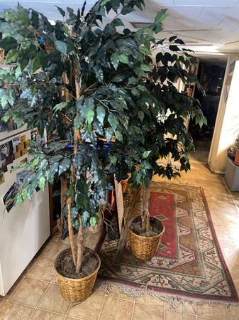 This is for both of these Ficus Silk Tree artificial Faux plant trees that are both potted in wicker baskets. They both are very big and ceiling here is 6 foot 6 inches and smaller tree is about 3 inches shorter than that so 6"3 and taller tree is 7 foot. The taller tree goes out long about 36 and longer in areas. They are lifelike as can be and made great. They are very light as well and I carry them easy with one hand. They come in wicker baskets that is has them wrapped in a plastic under the fake tops of the pot which is almost like a hay type feel material.