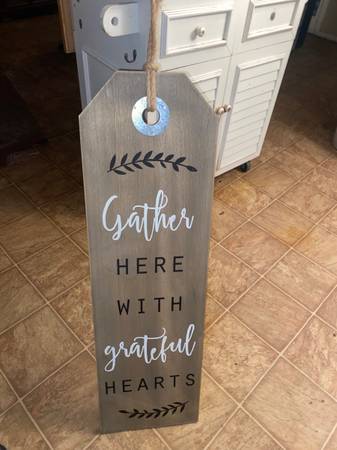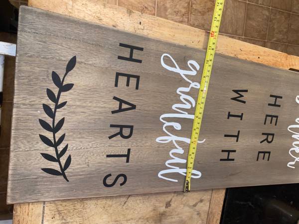 This is like New a sign that you can hang on your wall or front door. It’s made of real wood abs painted to say Gather Here With Grateful Hearts. Made as a welcome type sign for people for a home. Measures 3 foot long by 11 inches wide. Email or text with any questions.