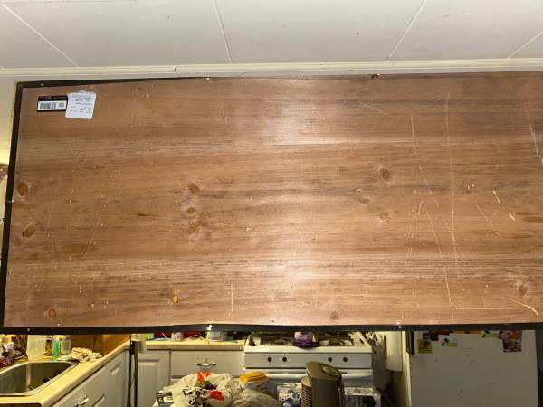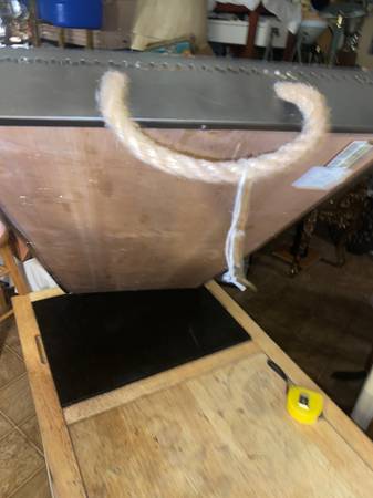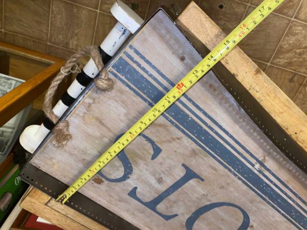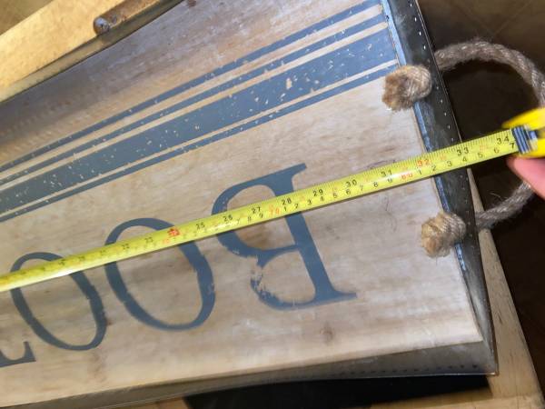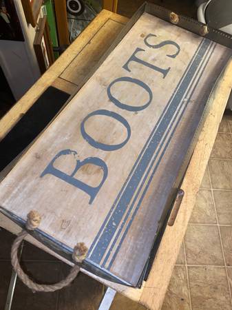 The boots sign is made of wood and distressed to give older look to it. The frame is made of metal with rope handles. I think great for a foyer area near cubby spot or hallways. Email or text with any questions. It’s form Bed bath and beyond.