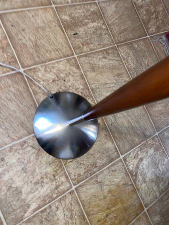 This is a very sort after MCM designed Laurel floor lamp. The body is all made of wood and walnut color with sleek thin to wider in middle and back to thin on top design base. The bottom and top and chrome or nickel color. The lamp is 59 inches high 10 inch long at base and shade is 14 inches wide.