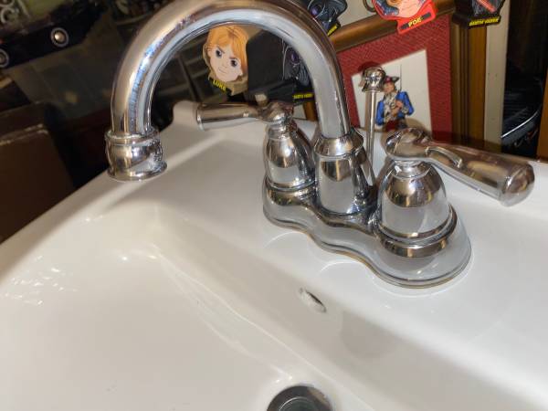 This is in great condition a Mgickwoods brand white porcelain bathroom sink with round face plus Stainless steel faucet and all the hardware under the sink to just hook up to water line. Fits in or on top of a 24 by 12 inch bathroom cabinet. And measures the sinn itself 24 inch long 17 wide abs 5 inch deep. Has drain plug in back as well. I posted tons of pictures from all angles. Ready to install in a few minutes like this. Email or text with any questions.