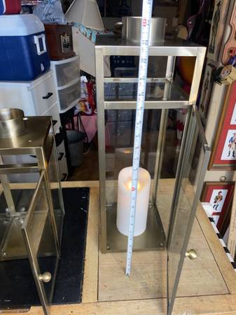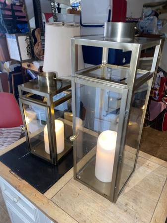 These are higher end well made real brass lantern candle holder displays. They are made to use with real candles with openings above and on top around the glass. The price is for both of these lanterns that have hinged doors as well as life like candles that work on battery in there. Both candles have normal light on mode and flickering light like a real candle does. They measure 24 and 16 inches high. And 8 and 7 inches long. In excellent or better condition. Great for indoor or outdoor use. These originally were from a store in NYC and I was told cost over 200 for the both and that was without the candles. These come with candles in them.