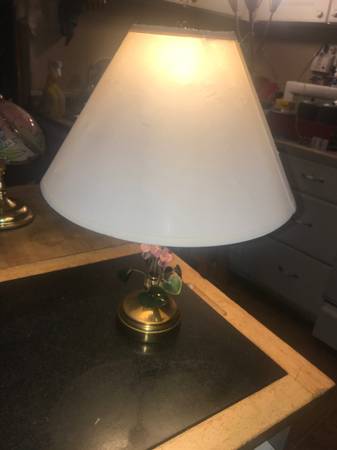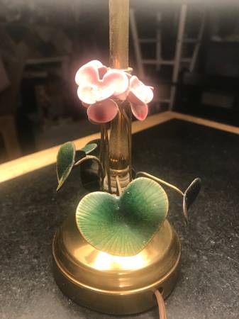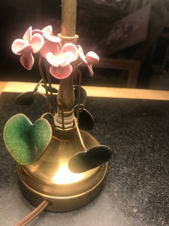 This is a very nice vintage pop out design of flowers and leaves going around the base of this desk or table lamp light. The lamp is old and in excellent shape and made of brass and the flower and leaf is like a porcelain I think. Measures 14 inches high 10 1/2 inch long on shade. Lamp is in perfect condition and color and same. Shade has some normal wear to it. Email or text with any questions.