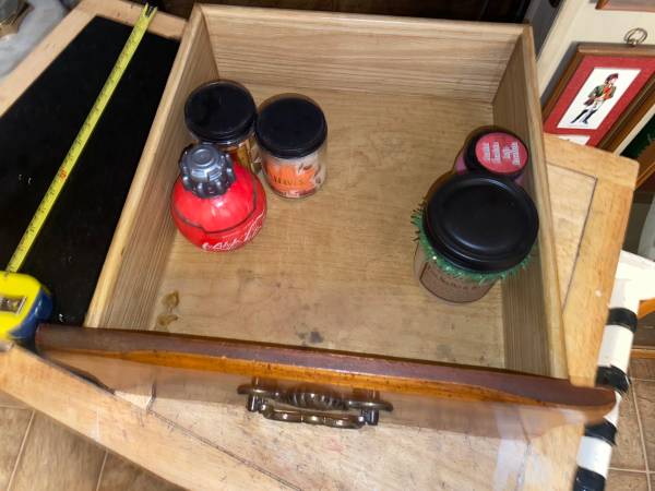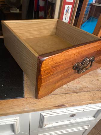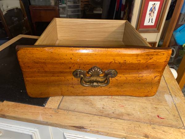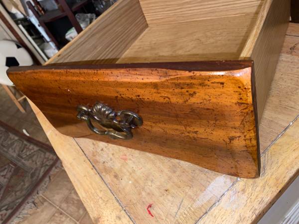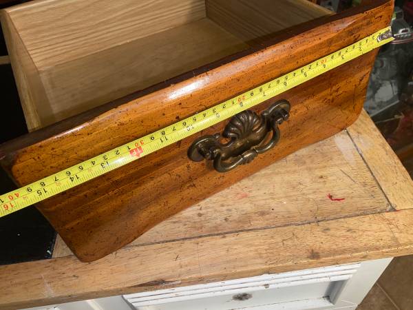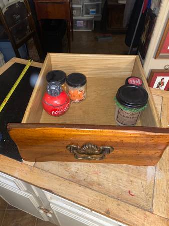 This is an older wood draw from an old dresser that is a great junk draw to put items in or display on a shelf. Brass fixture and measures about 6 1/2 inches high 15 1/2 long. I use a few to hold anything I might need in next to my work station. Can fill with candles or small paint cans or things you use everyday. Email or text with any questions.