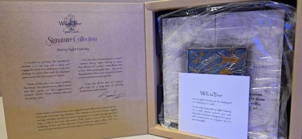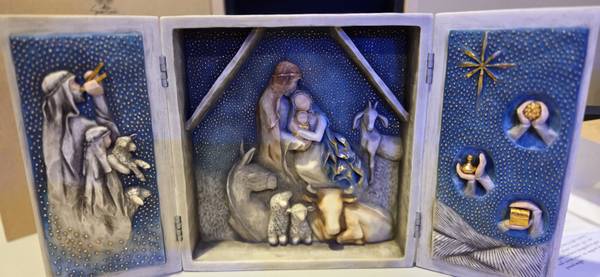 Exterior of cream box is decorated with gold carvings and blue etchings. Inside - bas-relief carving of scenes from the Nativity, decorated with blue and gold-leaf dots, shepherd playing instrument carved on inside left door.
