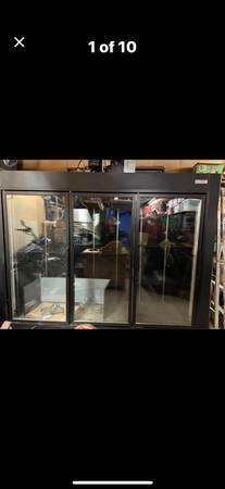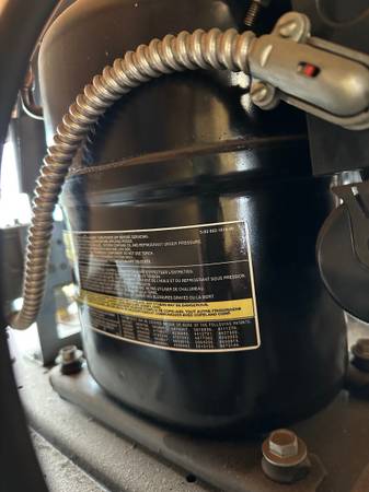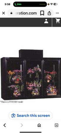 The floral display cooler was six months old before was put into storage. It’s 103 wide by 77.5 high. And 32 inches deep. The compressor is meant to sit on top so that’s an additional height. It’s 115 V. Comes with six shelves andWith heated doors , the interior is lighted. Please feel free to contact me for any other information.