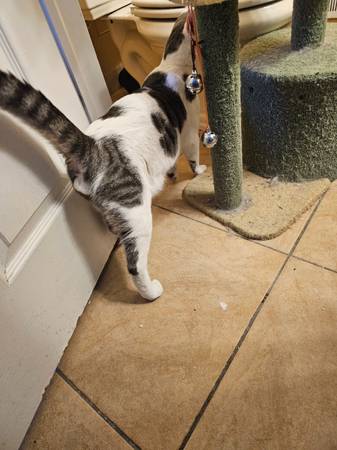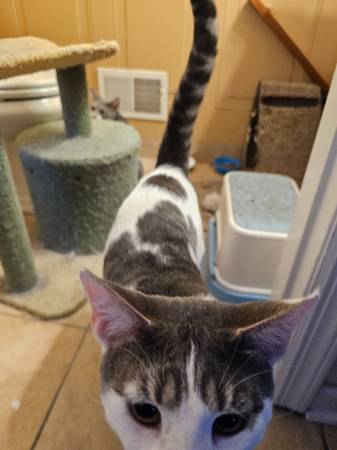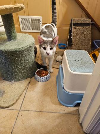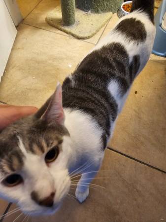 10 months old American short hair cat. White with Grey spots. Not immunized. Potty trained. The nails has been very recently cut/trimmed.