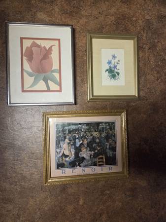 2 large pictures were expensive. Frames gorgeous 29 1/2 " x 25 1/2 " both for $25 Hand painted 36" x24 " $15 Picture frame wooden 28" x 17" $15 Flower picture 17"x 17" $10 Smaller pictures $5 each