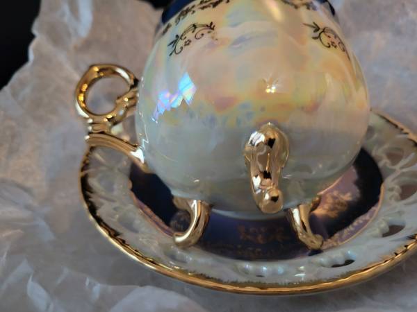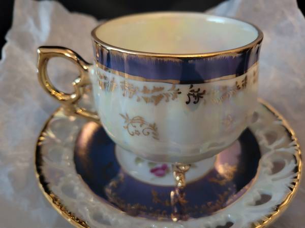 The set includes 6 cups, 6 saucers, a tea pot with lid, creamer and sugarbowl with lid. All designed in a vine pattern with a beautiful floral focus point. ** One of the design factors that drew us to this set was the three pedastal legs which you don't too often.